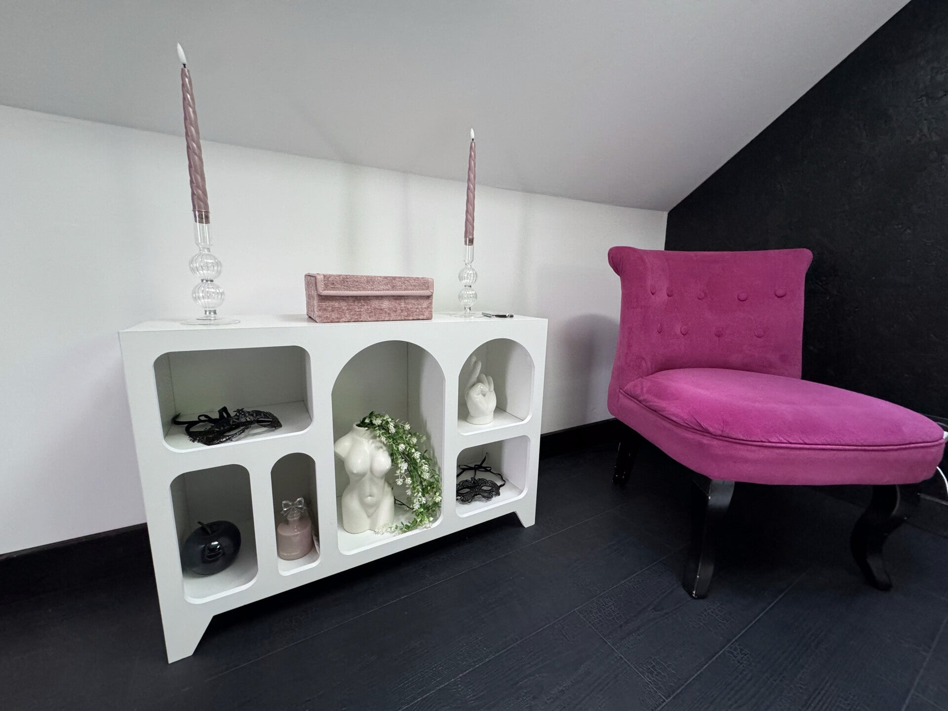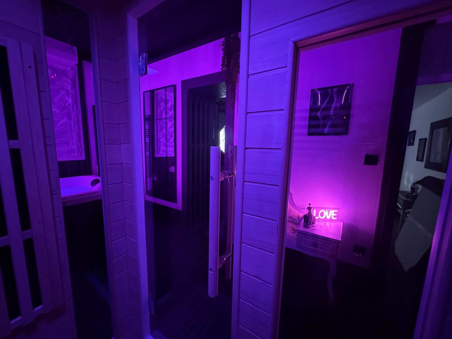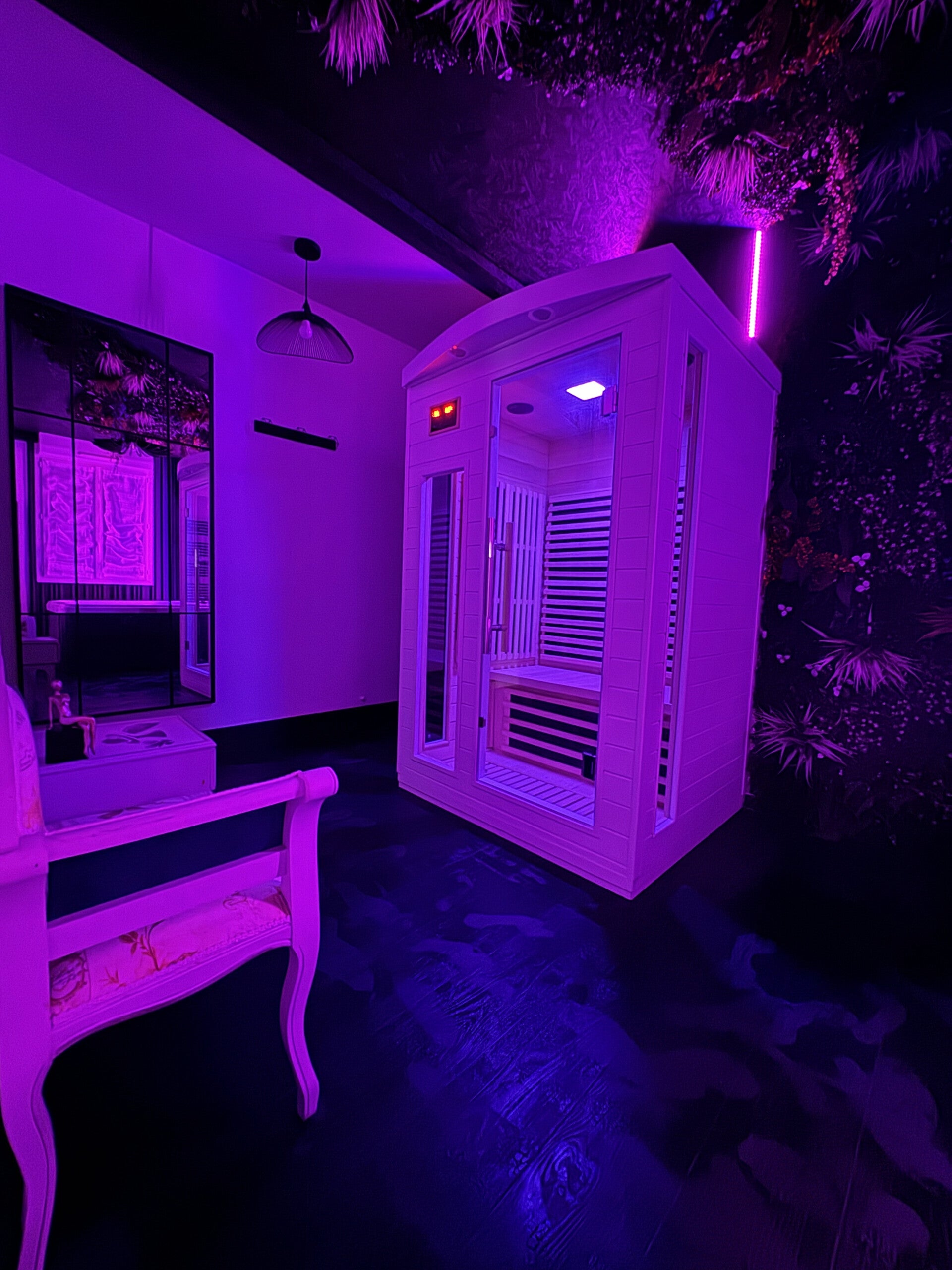 Laissez-vous séduire par notre pièce spa, un havre de paix et de sensualité. Imaginez-vous vous détendre dans le jacuzzi, suivi d'une séance de sauna, avant de rejoindre le confort et l’érotisme de votre chambre. Chaque détail est pensé pour une évasion parfaite.