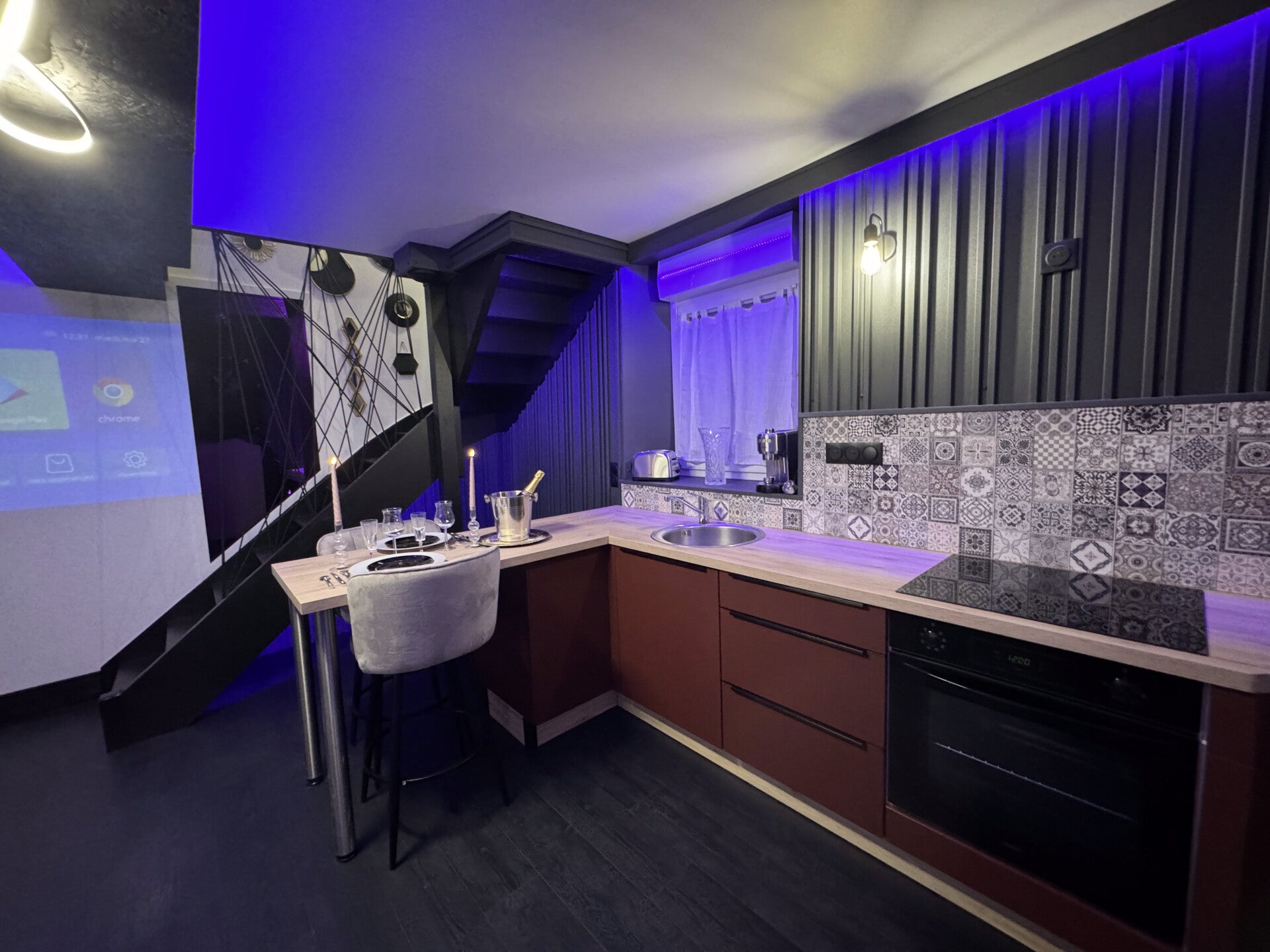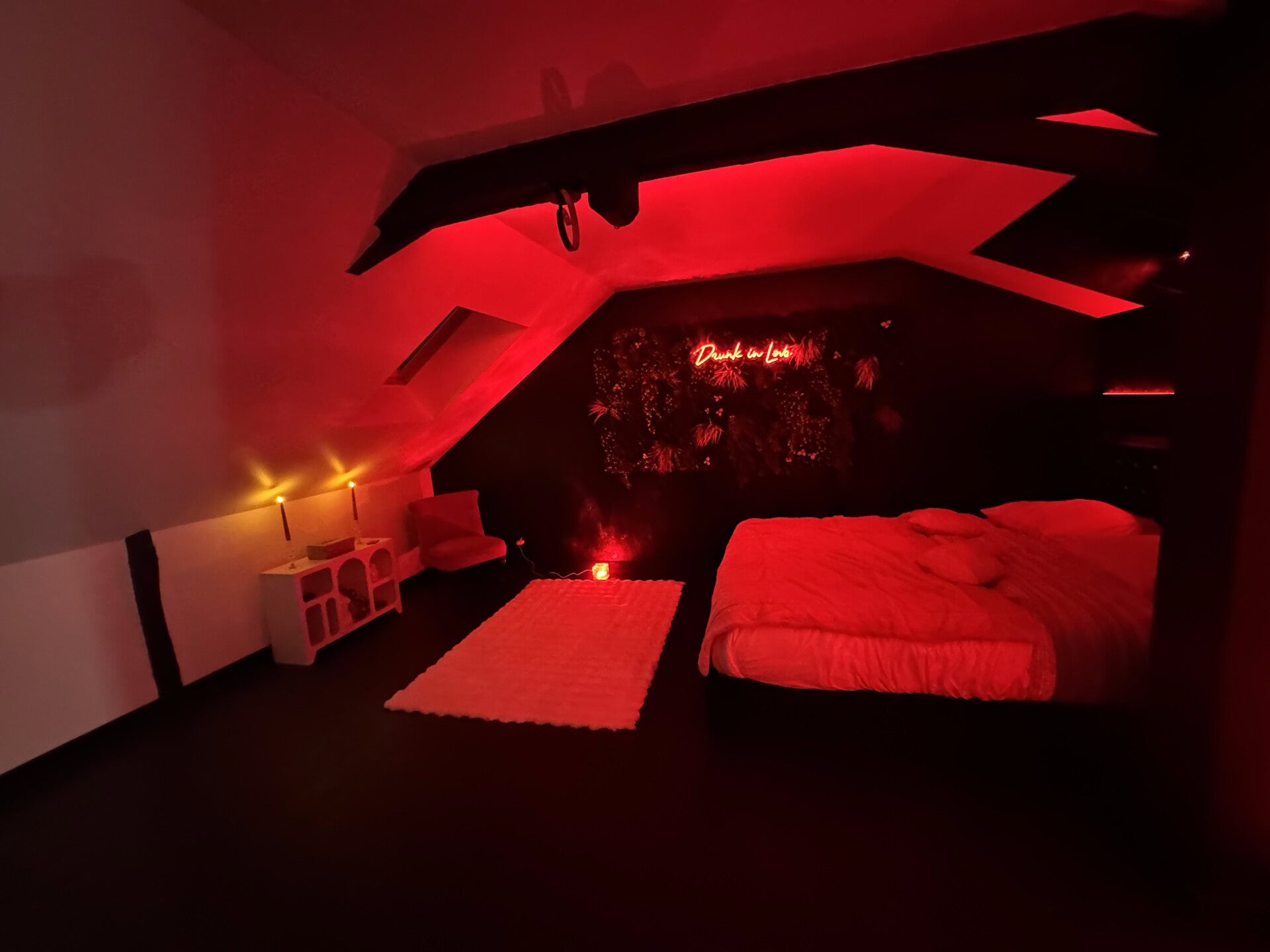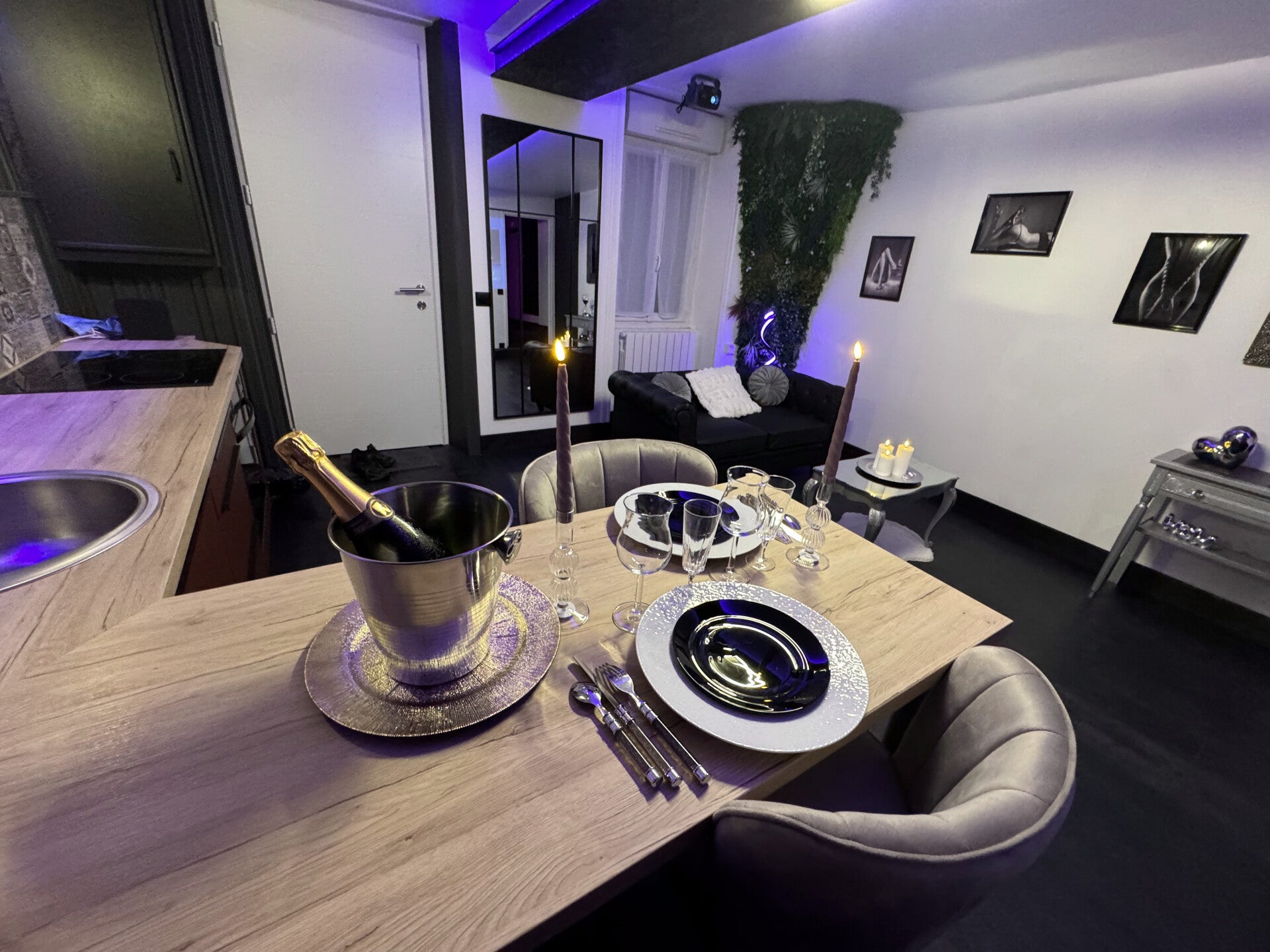 Dans la pièce de vie Notre décoration atypique, avec son mur végétalisé, son mobilier baroque tranchant avec la decoration moderne et son éclairage LED interchangeable, crée une atmosphère à la fois romantique et excitante. La cuisine est entièrement équipée.