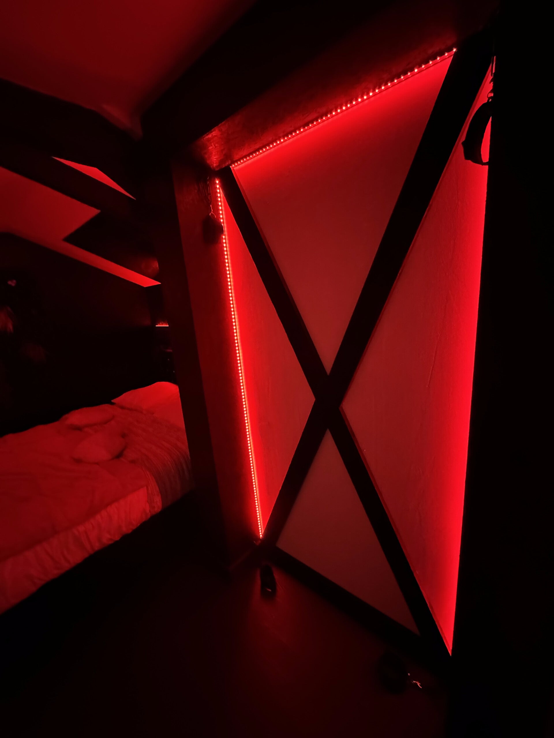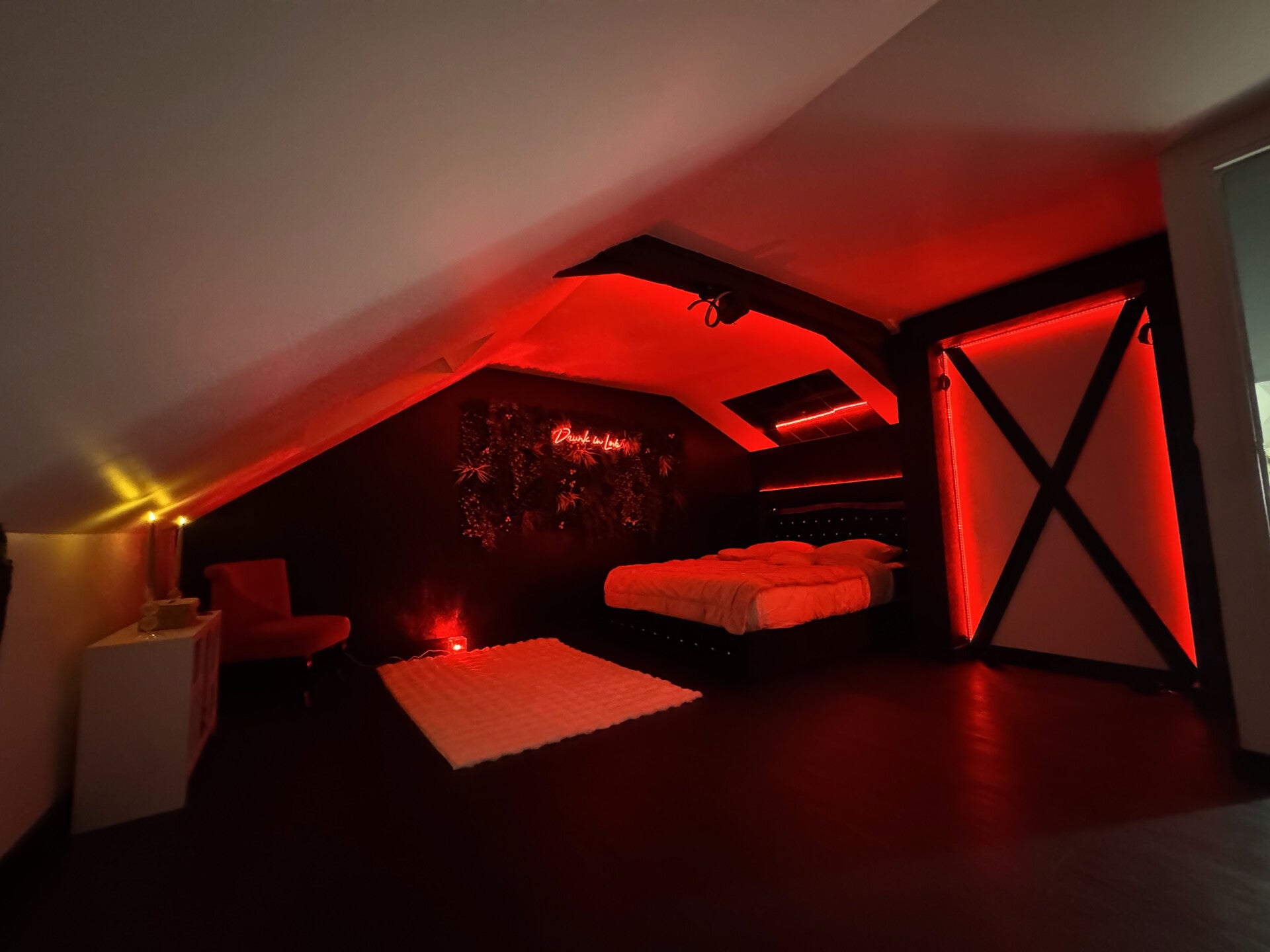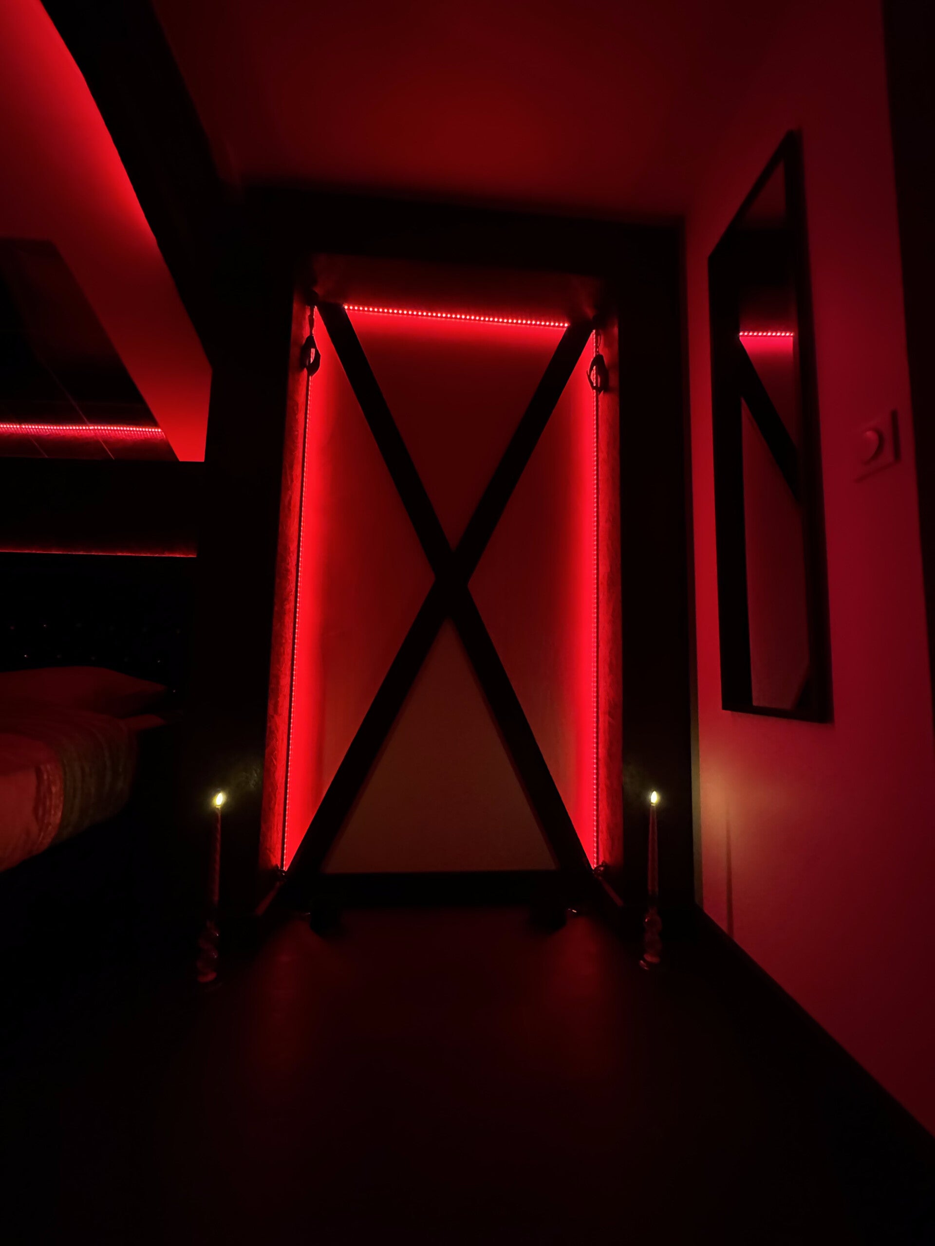 La chambre de L'Evasion Secrète Love Room Spa est entièrement équipée pour répondre à toutes vos envies le lit avec ces strass et son éclairage personnalisé : tout est là pour vous offrir un moment d'évasion parfait. Le miroir au-dessus du lit et la croix de Saint André le sofa tantra ajoutent une touche d'audace à votre séjour.